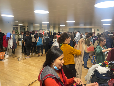 Organisiert wurde der Standort damals von unserer Standortverantwortlichen Laura, die selbst an der STF studierte. Die Tauschbörse fand im Foyer der Schule im Zürcher Kreis 4 statt – urban, lebendig und mitten in einem kreativen Umfeld. Gestartet hat alles mit einer „Langen Nacht des Kleidertauschens“, oft mit stimmungsvoller musikalischer Begleitung und spannenden Kooperationen. Bei der Premiere war zum Beispiel Fashion Revolution Schweiz mit dabei und trug mit einer Aktion zur Sensibilisierung für faire Produktionsbedingungen bei.